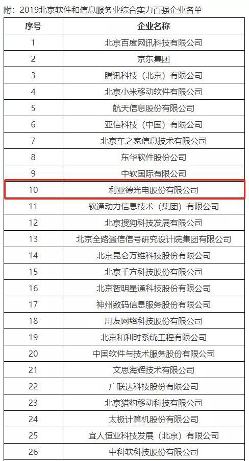 2019年11月20日,北京軟件和信息服務業(yè)協(xié)會發(fā)布了2019北京軟件和信息服務業(yè)綜合實力百強企業(yè)報告,利亞德榮膺“2019北京軟件和信息服務業(yè)綜合實力百強企業(yè)”,這是利亞德連續(xù)三年獲此殊榮。