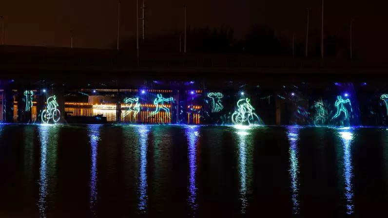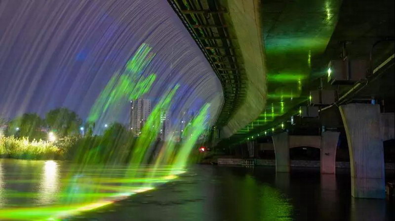伴隨著場景變化,在水幕上呈現(xiàn)出五彩繽紛的影像