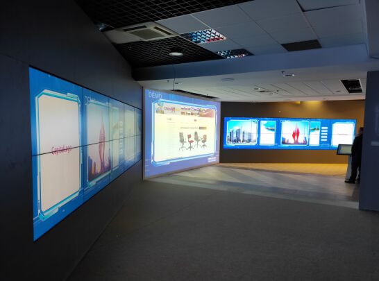 展示中心的大屏幕顯示系統(tǒng),共采用了銳麗4套55寸液晶拼接大屏幕顯示系統(tǒng)、4臺(tái)43寸觸摸一體機(jī)。安裝了大屏幕后的展示中心瞬間提升了N個(gè)格調(diào),帶著濃濃的現(xiàn)代化氣息。
