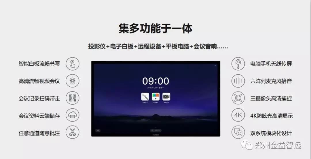 會議每時每刻都在發(fā)生,人們通過會議交流信息、達(dá)成共識、協(xié)同共創(chuàng)。會議是昂貴的商業(yè)行為,設(shè)備、人員、時間無一不是成本。在早期的會議室里,顯示昏暗的幕布,混亂不堪的線材,以及設(shè)備調(diào)試等待的時間,讓我們感到會議效率被大大降低了。我們設(shè)想,在企業(yè)會議室里,應(yīng)該有一面清晰的會議屏,在上面書寫沒有空間限制,設(shè)備可以無線連接,會議不再需要人工記錄,無論我們在哪里,都能和業(yè)務(wù)伙伴身臨其境地溝通。