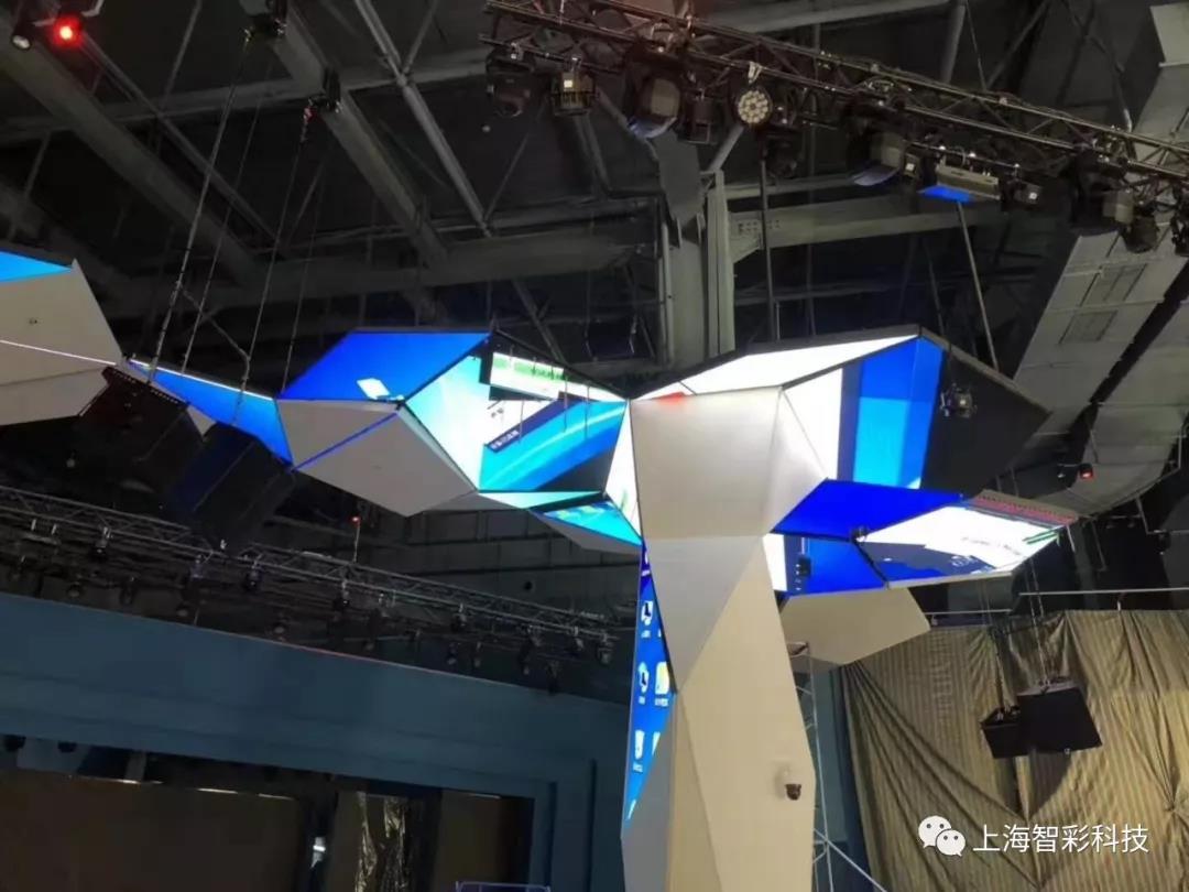 多塊三角形屏幕形成一塊多邊形顯示屏,外形上絢麗奪目,視頻播放,顯示屏拼接等技術(shù)上更是需要多年技術(shù)的沉淀