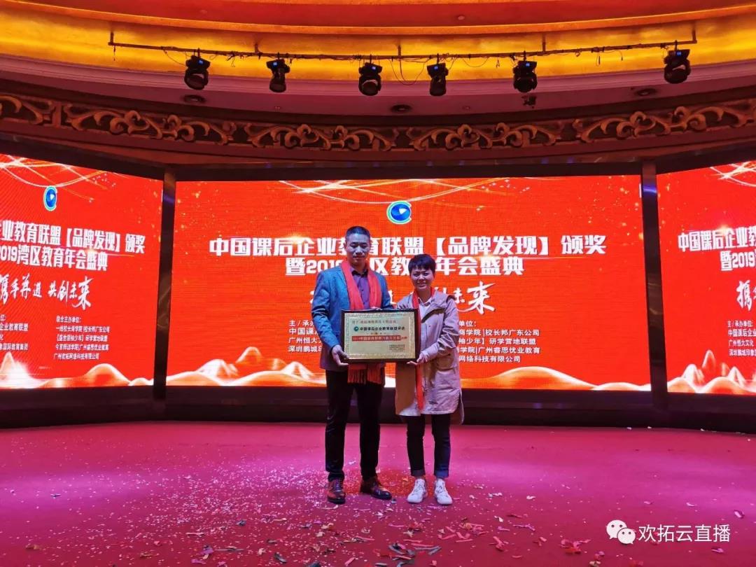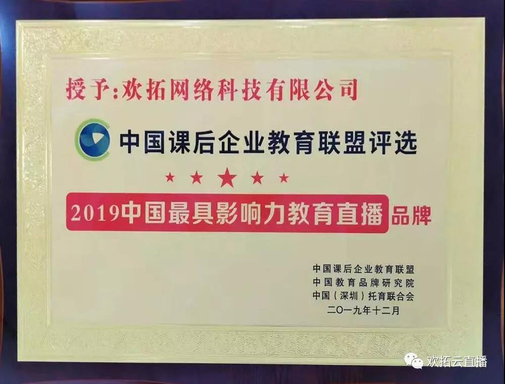 歡拓云直播被中國(guó)課后企業(yè)教育聯(lián)盟、中國(guó)教育品牌研究院、中國(guó)(深圳)托育聯(lián)合會(huì)評(píng)選為“2019中國(guó)最具影響力教育直播品牌”。