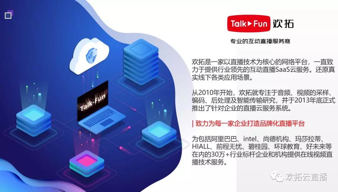 歡拓是一家專(zhuān)門(mén)提供線上教育直播技術(shù)解決方案的公司,以直播穩(wěn)定流暢、低延遲、快速響應(yīng)服務(wù)等優(yōu)勢(shì)成為眾多企業(yè)機(jī)構(gòu)的長(zhǎng)期合作伙伴。歡拓會(huì)始終本著“技術(shù)讓教育更輕松”的宗旨,提供最好的產(chǎn)品和最優(yōu)的服務(wù),為中國(guó)教育互聯(lián)化的升級(jí)轉(zhuǎn)型提供強(qiáng)大的支持保障!