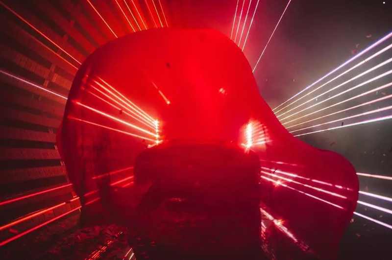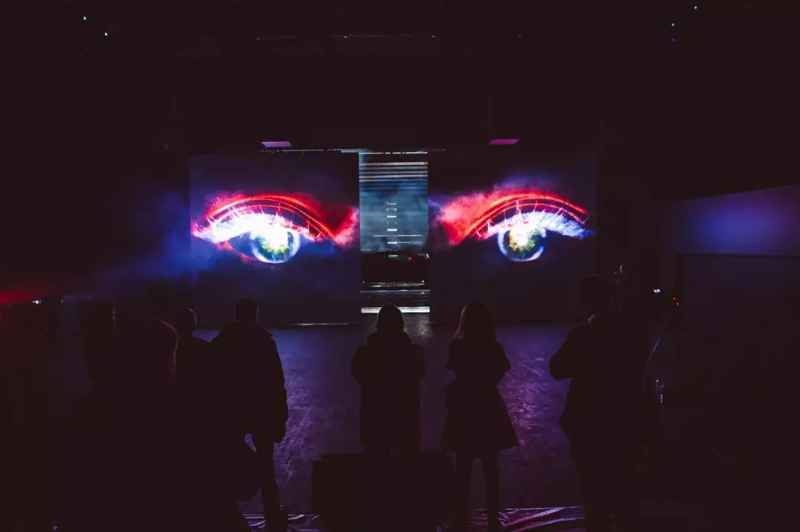 最特別的特征是紅色雪紡帶漂浮在舞臺上,與汽車一樣,它消除了真實世界和虛擬世界之間的界限。