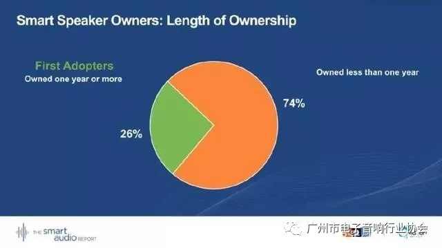 第一批智能音箱采用者擁有音箱一年及以上的占26%;擁有時(shí)間少于一年的人占74%