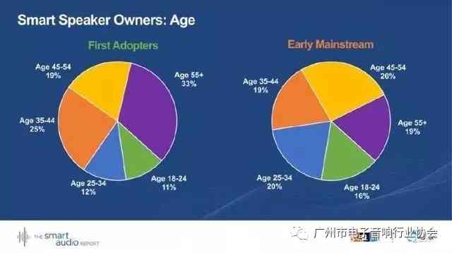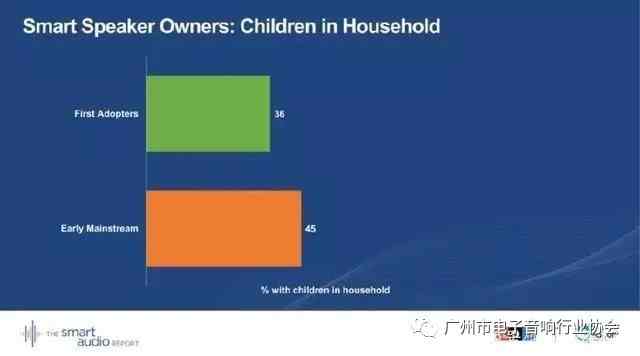 上圖顯示,第一批智能音箱采用者群體中,有孩子的家庭占據(jù)36%;早期主流消費(fèi)者中,有孩子的家庭占45%。