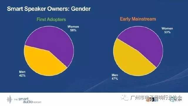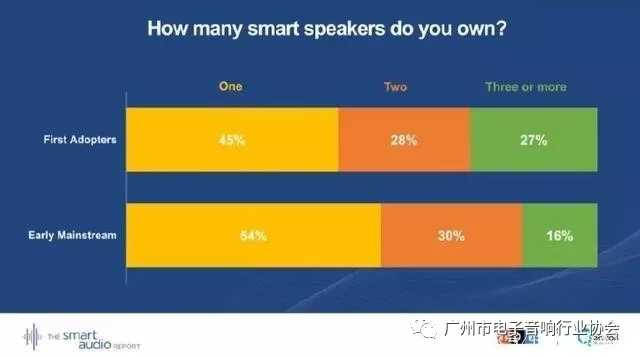 在第一批智能音箱采用者中,擁有一臺智能音響的占45%,擁有兩臺的占28%,擁有三臺的占27%;在早期的主流消費(fèi)者中,擁有一臺智能音響的占54%,擁有兩臺的占30%,擁有三臺的占16%。