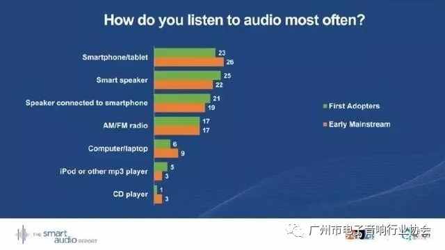 對于第一批智能音箱采用者來說,使用智能音箱聽音頻的比重最大,其次就是智能手機(jī)相關(guān)設(shè)備、此外還有智能手機(jī)連接智能音箱后收聽音頻。使用收音機(jī)、電腦、MP3以及CD機(jī)收聽音頻的頻率都依次減少。