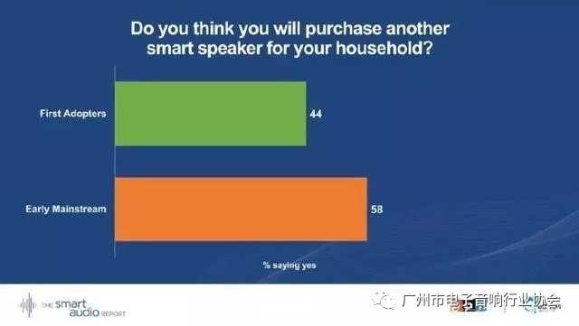 有58%早期的主流消費(fèi)者表示還想要在家中購買另一個(gè)智能音箱,這一群體的購買欲望要大于第一批使用者的44%。