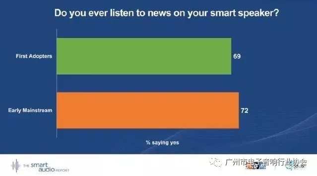 上圖顯示,第一批智能音箱采用者中有69%的用智能音箱收聽過新聞,早期的主流消費(fèi)者有72%的收聽過。