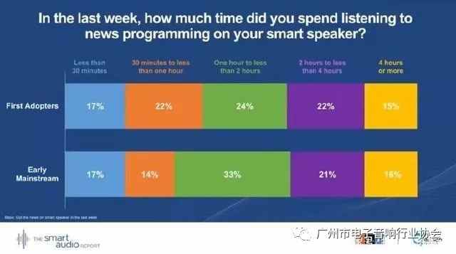 聽新聞成為第一批智能音箱采用者和早期主流用戶使用的重要驅(qū)動力:37%的用戶每周使用智能音箱收聽至少2小時(shí)的新聞。
