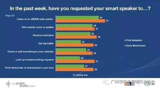 上圖顯示,早期的主流消費(fèi)者對于利用智能音箱要比第一批的使用者更加活躍。但整體的使用內(nèi)容是趨同的,頻率由高到低分別是:聽音樂,收聽天氣預(yù)報(bào),回答簡單問題,設(shè)定時(shí)鐘,提醒時(shí)間,收聽新聞,聽笑話,聽FM廣播,收聽體育信息,設(shè)置提醒,獲得道路交通狀況消息,查詢或者添加個(gè)人日程表,查詢菜譜,尋找附近的餐廳或者商場,控制家庭電器,給購物清單添加新的東西,將一些事情加入到行動表中,打電話,讓智能音箱和家里的東西進(jìn)行連接,收聽有聲雜志,玩游戲(比如,冷知識)。