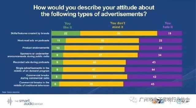 該報(bào)告還調(diào)查了智能音箱用戶對廣告的態(tài)度:
