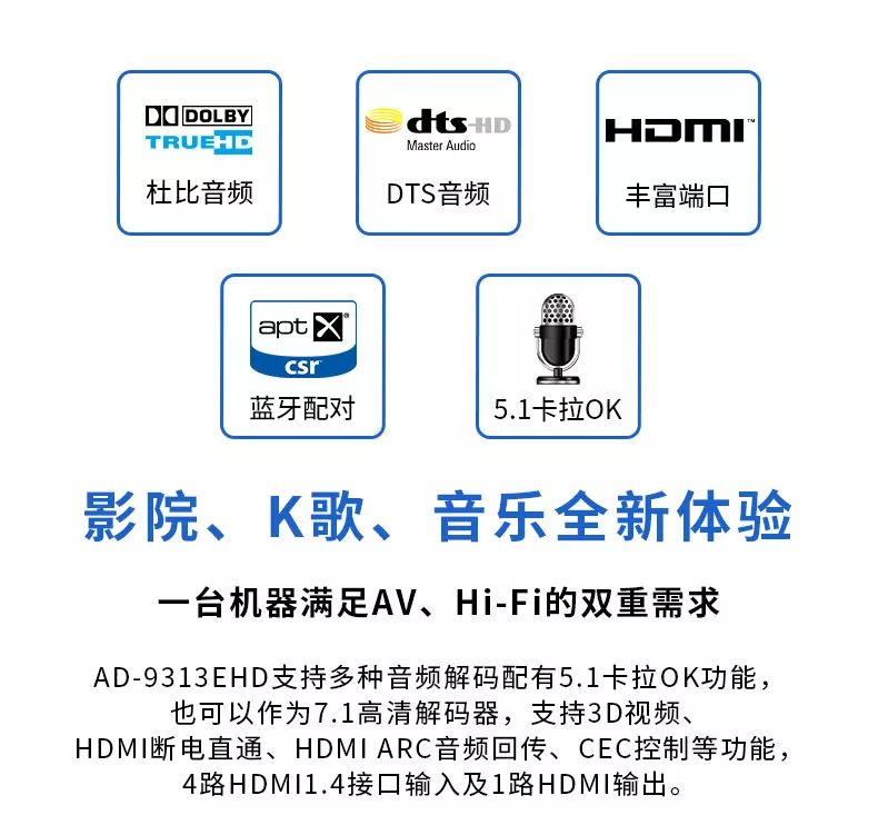 AD-9313EHD是定位于組建中高檔家庭影院的中端主流產(chǎn)品,是專門為追求高保真和環(huán)繞臨場感更為突出的中高端家庭高清影院而設(shè)計的。它支持HD/SD音頻解碼、智能房間聲學(xué)特性掃描功能、音箱頻率曲線校正、低音管理、專業(yè)級Reverb效果卡拉OK功能,也可以作為7.1高清解碼器使用,在視頻方面支持3D視頻、HDMI斷電直通、HDMI ARC音頻回傳、HDMI CEC控制等功能,4路HDMI1.4接口輸入及一路HDMI輸出,足以滿足所有的應(yīng)用需求。而在音質(zhì)表現(xiàn)方面,也足以滿足中端用戶的需求。而天逸AD-9313也因此成為了工薪階層最適宜選購的功放,一部機子搞定AV、Hifi的雙重需求。