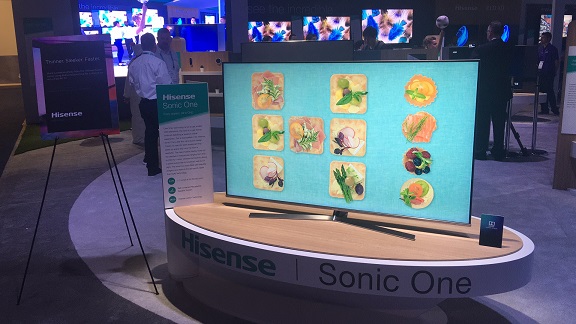 2019年CES展的海信展臺(tái),一臺(tái)65吋的Sonic-one液晶電視因?yàn)槌跸胂蟮谋『统驳脑O(shè)計(jì)吸引了很多參展者。