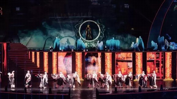 在舞臺(tái)燈具選擇上,使用了1400W切割燈和1400W染色燈做為主要燈具用于大面積染色和各區(qū)域照明,其優(yōu)點(diǎn)是顯色指數(shù)高,光通量高,非常適用于戶外遠(yuǎn)距離投光染色。另外采用470W三合一燈具作為局部氛圍效果燈具。除此以外,還沿著整個(gè)水舞臺(tái)周圍還運(yùn)用了45℃的條形染色燈作為水面染色和演員的氛圍烘托。為了讓海難場(chǎng)面的一幕更加逼真,在全場(chǎng)觀眾背后的最高點(diǎn)設(shè)計(jì)了16臺(tái)大功率白光頻閃,配合環(huán)繞音效模擬風(fēng)暴雷電效果,給觀眾一種置身其中的感覺(jué)。