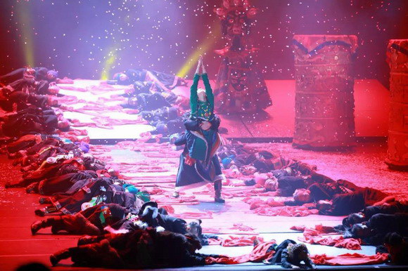 舞美燈光全面升級,引進(jìn)珠江燈光尊能PR-6000系列的搖頭電腦燈,絢麗壯闊的云南風(fēng)光躍然于舞臺之上。清風(fēng)徐來,時而仿佛游走在峽谷之中,時而在梯田徘徊,時而在雨林中徜徉,空靈的音樂,清亮的山歌,為生命而舞的族人,仿佛已置身于云南村寨中,讓人忘記這是舞臺。