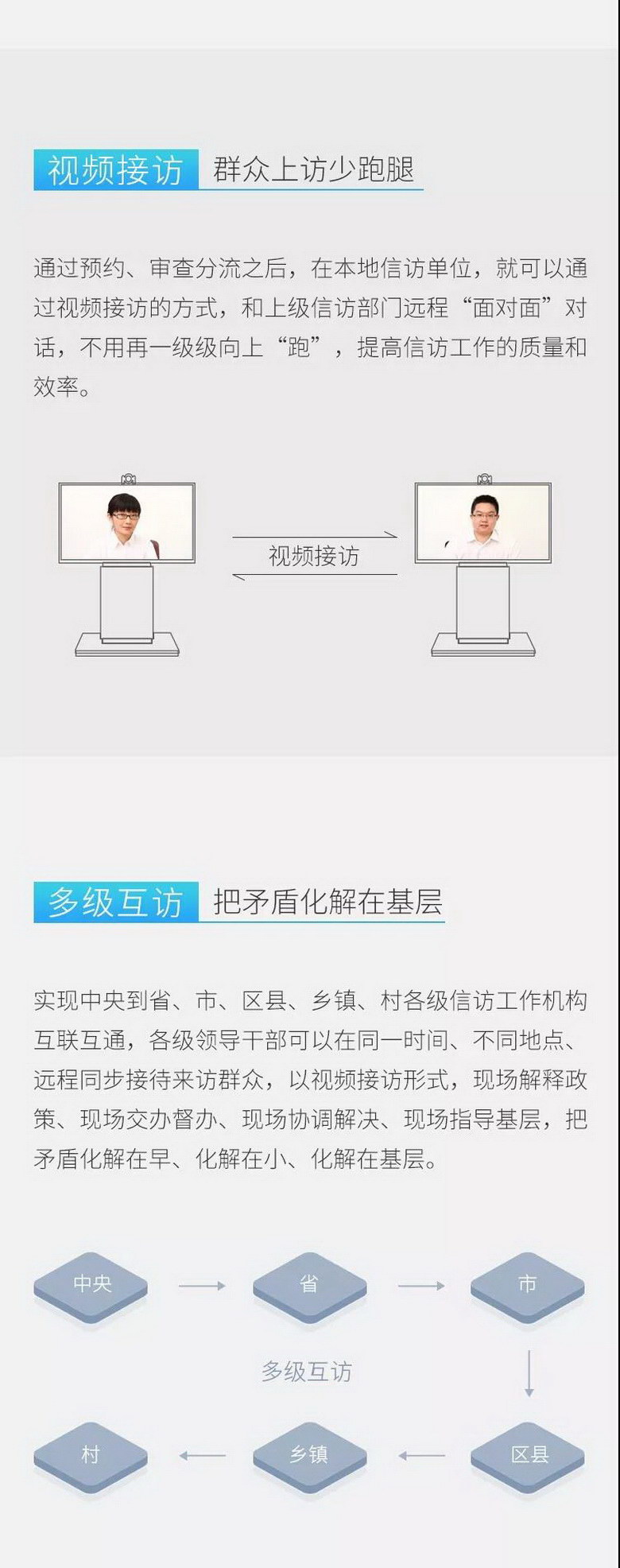 國家信訪局視頻信訪系統(tǒng)由科達(dá)建設(shè)完成,系統(tǒng)實現(xiàn)日常視頻會議、信訪業(yè)務(wù)視頻培訓(xùn)、重要復(fù)雜信訪案件雙方或多方視頻會商、個別案件遠(yuǎn)程視頻接訪、可視應(yīng)急視頻指揮調(diào)度五大應(yīng)用,擁有豐富的業(yè)務(wù)平臺及服務(wù)系統(tǒng),聯(lián)通全國31個省市及新疆生產(chǎn)建設(shè)兵團信訪工作機構(gòu),服務(wù)新時代信訪工作。