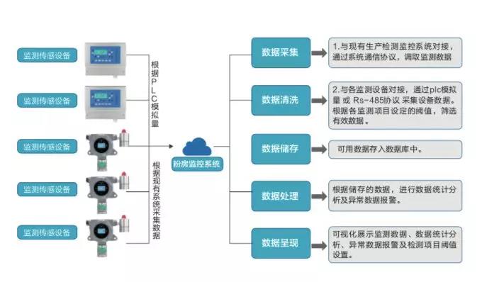 通過粉房重點部位監(jiān)測系統(tǒng),實現(xiàn)產(chǎn)線在連續(xù)運行狀態(tài)下,自動采集工藝參數(shù)、爐溫數(shù)據(jù)、接地電阻、粉塵濃度及粉房溫濕度等數(shù)據(jù)信息并進行統(tǒng)一分析,當數(shù)據(jù)異常時進行報警。