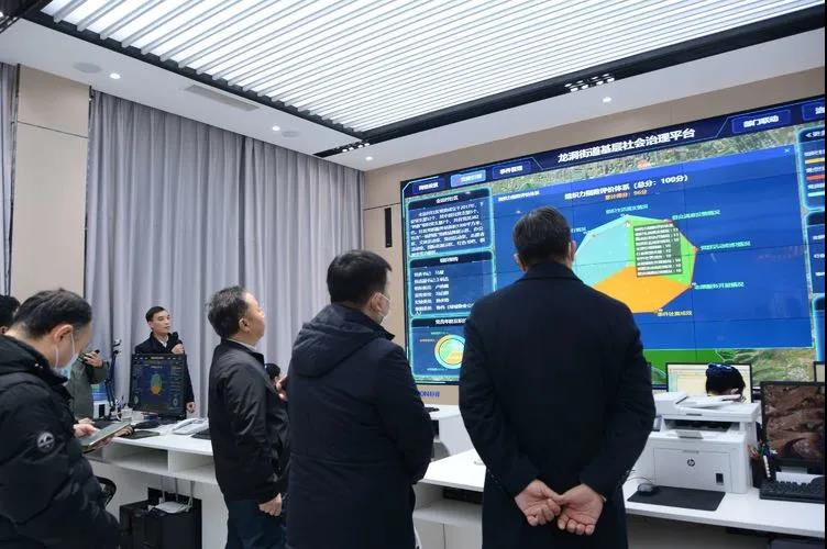 觀摩團到達龍洞街道社會治理指揮中心,解偉同志從街道黨建品牌、共建共治舉措、行走龍洞運作流程、考核評估監(jiān)督機制等方面,向觀摩團進行了詳細介紹。隨后,指揮中心工作人員現(xiàn)場操作指揮大屏,講解指揮中心事件處理流程、部門聯(lián)動、治理隊伍建設(shè)情況。觀摩團對街道黨建項目運行一年以來的成果表示認可,并希望街道繼續(xù)細化黨建項目運作流程,爭取取得更好的成績。