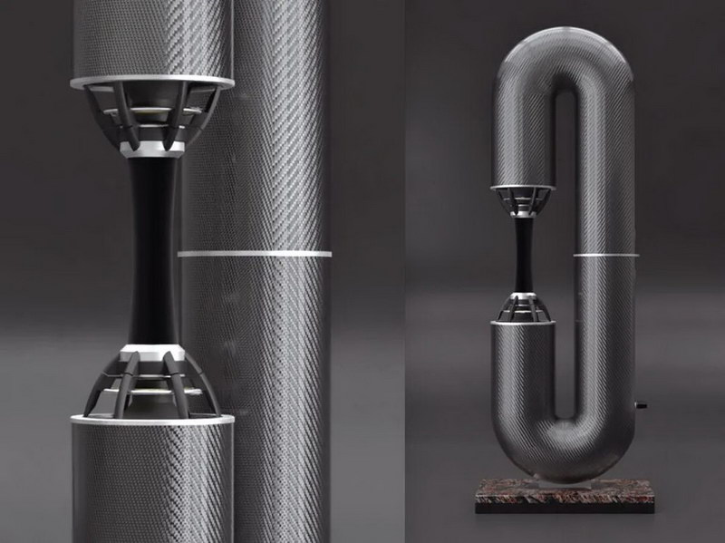 唯一的問(wèn)題是BRS單元仍受限振膜面積,而且媲美靜電膜的輕量級(jí)振膜無(wú)法再生很低的頻率,所以只能當(dāng)中高音單元使用,分頻點(diǎn)大概在2kHz左右,直到20kHz以上都能全向發(fā)聲。Zoltán Bay設(shè)計(jì)了二個(gè)彎曲的大水管,上下疊放在一起,水管開(kāi)口安置倒置的傳統(tǒng)錐盆低音,低音單元振膜帶有埃及紙莎草紙,向水管內(nèi)部發(fā)聲再?gòu)谋趁娣瓷淇讓?dǎo)出。二個(gè)低音單元之間夾著B(niǎo)RS圓柱形高音360度發(fā)聲,而低音也近乎無(wú)指向性的擴(kuò)散,整個(gè)大水管音箱因此可以不受限制擺放在房間的任何地方。水管以重量輕、硬度高的碳纖維制作,最下面有堅(jiān)固的花崗巖底座,箱體內(nèi)部加上特殊阻尼材料,讓原本的不平行面進(jìn)一步減少震動(dòng)與箱內(nèi)駐波。分頻器設(shè)計(jì)也很簡(jiǎn)單,包括特制的電容和空心電感,使用50瓦以上的功放就能很好驅(qū)動(dòng)。別以為Bayz Audio的水管音箱只是外觀漂亮,碳纖維要做成這模樣真是不簡(jiǎn)單,碳纖維板實(shí)際上是碳纖維編織后一層一層粘接而成,兼具超高強(qiáng)度及相對(duì)于金屬較輕的密度。一定長(zhǎng)度下能彎曲多少而不被破壞實(shí)際上取決于粘接材料和工藝。碳纖維板的強(qiáng)度是各向異性的,抗拉強(qiáng)度遠(yuǎn)超過(guò)鋼板,而抗壓、抗撓強(qiáng)度和表面硬度卻低于鋼板,橫向過(guò)載時(shí)往往會(huì)發(fā)生脆性斷裂。所以碳纖維可以做汽車(chē)的鋼板,做游艇或浴缸的結(jié)構(gòu),卻很難做成球型,Bayz Audio的碳纖維水管工藝一流。