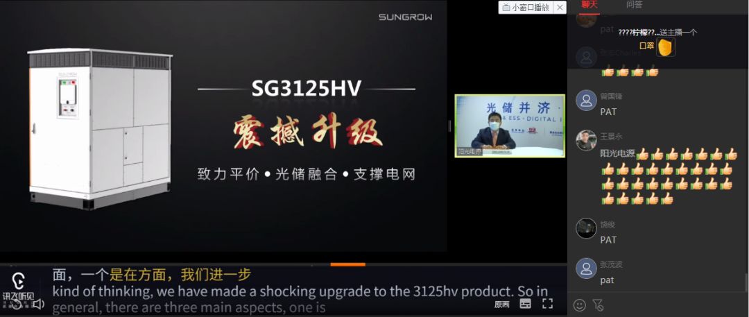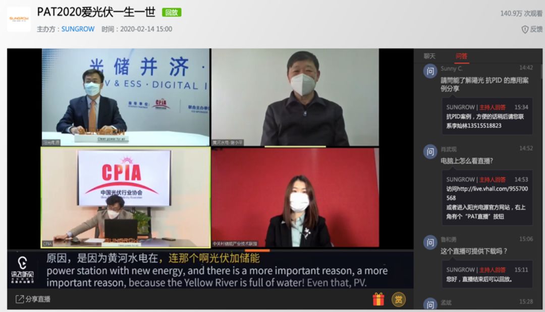 本屆PAT2020,陽(yáng)光電源與微吼合作,開(kāi)創(chuàng)了中國(guó)光伏技術(shù)研討暨新品發(fā)布“純線上會(huì)議”形式,兩小時(shí)在線觀看人次超過(guò)140萬(wàn),評(píng)論互動(dòng)數(shù)萬(wàn)條。由此,陽(yáng)光電源的這次直播也被網(wǎng)友稱之為光伏界“李佳琦”的誕生。
