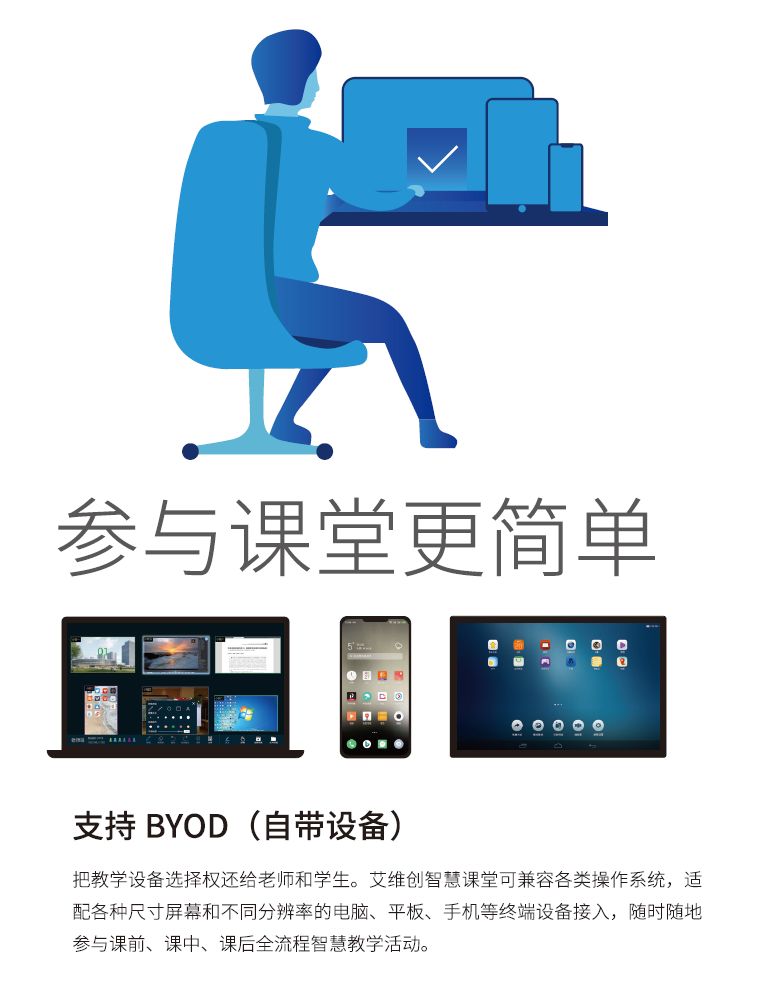 支持各種操作系統(tǒng)的平板、手機(jī)、電腦,適應(yīng)各種大小的屏幕和分辨率。學(xué)習(xí)者自帶設(shè)備接入,開(kāi)展自主研討、課題分享更便捷。