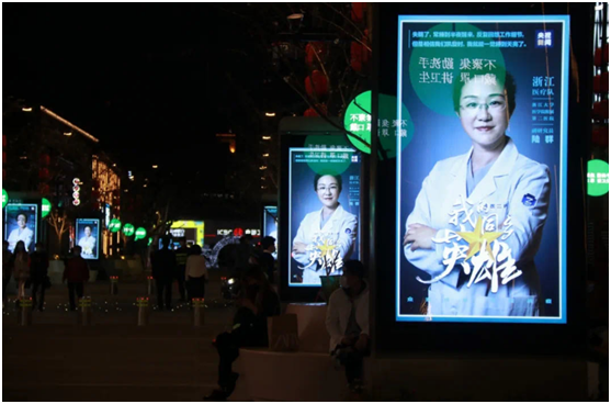 浙江省奮戰(zhàn)于抗疫一線的白衣戰(zhàn)士的身影和面容,在大屏幕上滾動播放,引得無數(shù)市民駐足觀看。