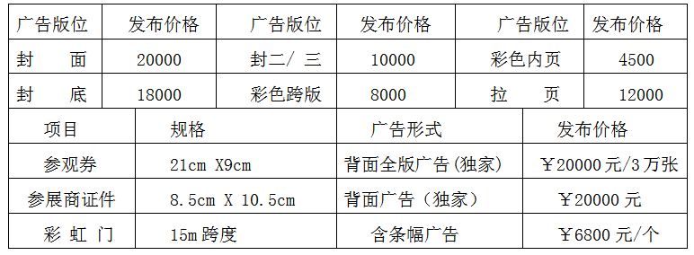 ≈會(huì)刊廣告≈ (會(huì)刊規(guī)格為130MM×210MM,廣告費(fèi)一律預(yù)收一次性付清;因故不能參展企業(yè),可直接選擇會(huì)刊及展場(chǎng)廣告宣傳) 。