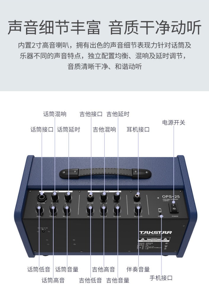OPS-25 便攜式彈唱音箱傾斜式箱體設(shè)計,緊湊輕便體積小、主機(jī)僅重約6kg,方便攜帶。同時擁有紅、藍(lán)、黑三款經(jīng)典色,時尚大氣雅而不俗。