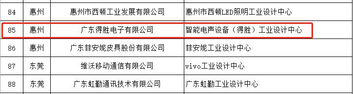 2019年廣東省第三批省級(jí)工業(yè)設(shè)計(jì)中心認(rèn)定名單公布,廣東得勝電子有限公司等106家單位成功入選。廣東得勝電子有限公司智能電聲設(shè)備(得勝)工業(yè)設(shè)計(jì)中心被認(rèn)定為“省級(jí)工業(yè)設(shè)計(jì)中心”。