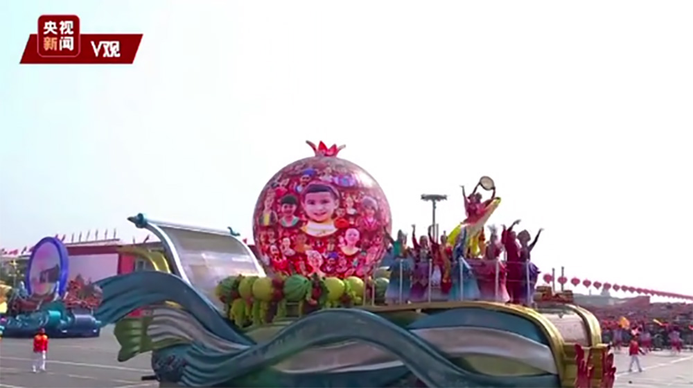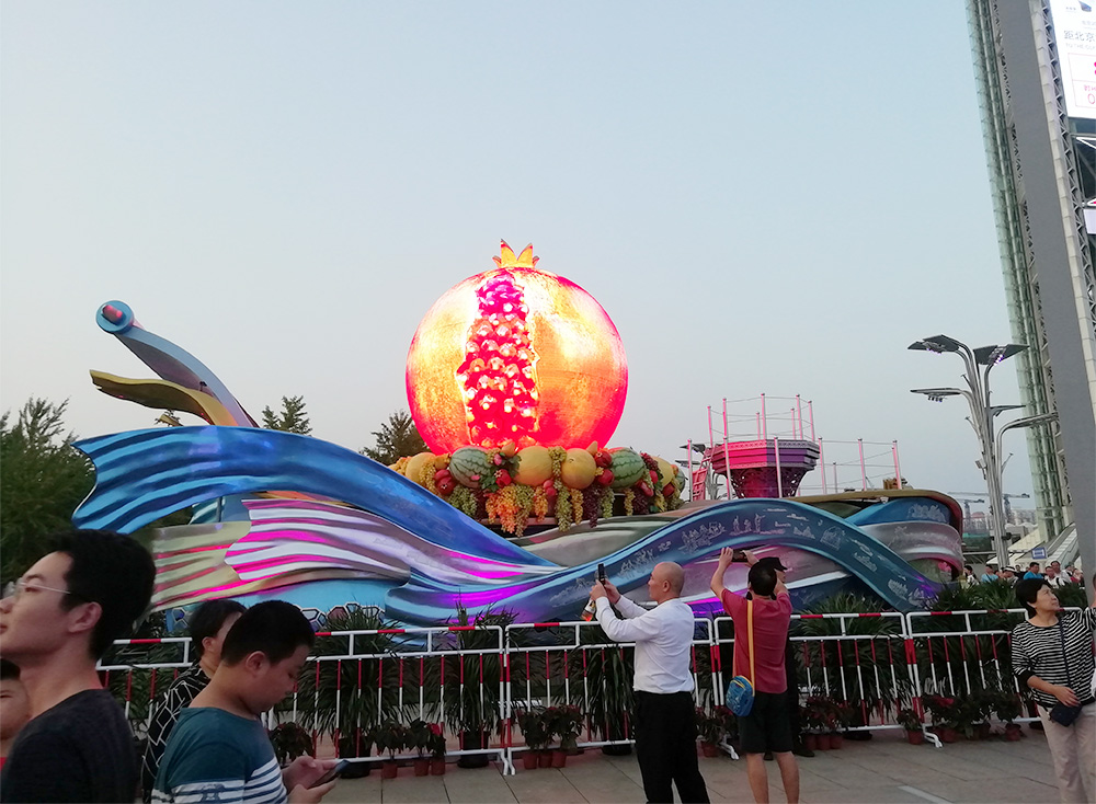 “石榴紅了”大型主題雕塑作為“美麗新疆”彩車的核心組成部分,主體元素為“石榴”, 象征著瓜果之鄉(xiāng)的新疆兩千五百萬各族兒女,像石榴籽一樣緊緊地抱在一起!懊利愋陆辈受囀艿玫街醒搿⒆灾螀^(qū)領(lǐng)導(dǎo)的充分肯定和社會各界的廣泛贊譽,被北京慶祝大會服務(wù)保障和群眾游行指揮部授予國慶70周年群眾游行地方彩車“華美獎”,更是被網(wǎng)紅們親切地稱為“甜甜的大石榴”“中國最美石榴”。