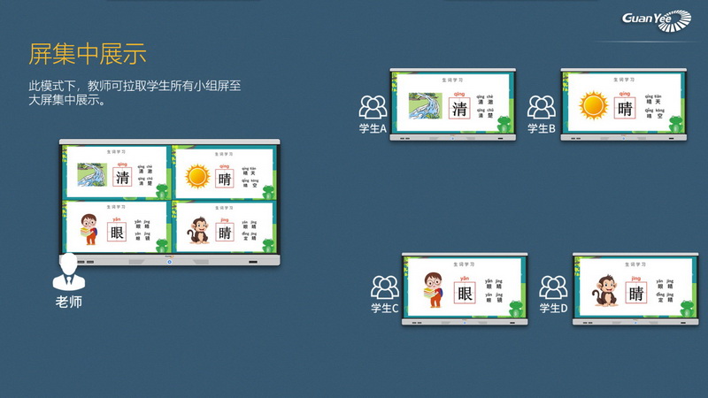 展示模式:老師主屏自帶控制功能,可輕松調(diào)取小組屏幕至主屏,其他小組屏默認自動同步顯示