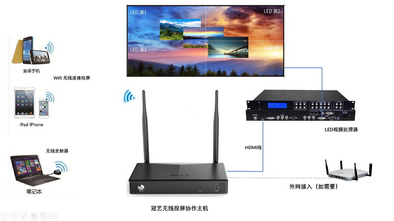 方案簡介: LED大屏特別小間距LED顯示屏近幾年蓬勃發(fā)展,市場規(guī)?焖僭鲩L,小間距LED屏憑借著其輕薄易安裝、適用范圍廣、生產(chǎn)速度快、使用壽命長等優(yōu)點(diǎn),快速搶占數(shù)字光處理投影技術(shù)(DLP)和大屏液晶的市場份額。 應(yīng)用領(lǐng)域廣泛,主要應(yīng)用領(lǐng)域有公共顯示、安防監(jiān)控、商務(wù)教育等。 目前中國LED大屏市場已過紅利期,市場已經(jīng)朝向產(chǎn)品精細(xì)化,性價(jià)比方向發(fā)展,常規(guī)LED大屏產(chǎn)品同質(zhì)化嚴(yán)重,生產(chǎn)企業(yè)、渠道商利潤擠壓嚴(yán)重、市場競爭激烈;如何增加LED大屏系統(tǒng)方案差異化,增加方案獨(dú)特性將是近今年該行業(yè)考慮的問題。冠藝無線投屏協(xié)作系統(tǒng)的推出將完美助力LED大屏系統(tǒng),豐富其投屏方案。 冠藝G801系列無線投屏協(xié)作系統(tǒng)可將Windows/Mac電腦、安卓/蘋果手機(jī)平板等設(shè)備屏幕輕松無線投屏至大屏幕顯示; 多終端同步連接最多可實(shí)現(xiàn)9畫面分割同時(shí)顯示。用戶只需將USB口發(fā)射器插入電腦,按鈕一鍵投屏,簡單方便 手機(jī)平板連接主機(jī)WiFi即可投屏,所有終端支持影音同步輸出,高清1080P,超低延遲,多終端畫面無縫切換 配合新品三合一接口發(fā)射器,可以將TYPE-C口電腦/手機(jī)、HDMI口電腦/機(jī)頂盒/攝影機(jī)等真正免驅(qū)一鍵投屏 做工品質(zhì)一流、支持7*24小時(shí)運(yùn)行、實(shí)用新型設(shè)計(jì)、豐富的功能拓展?jié)M足常規(guī)會(huì)議室,展廳,報(bào)告廳,教室,培訓(xùn),酒店等眾多場景應(yīng)用 系統(tǒng)連接圖