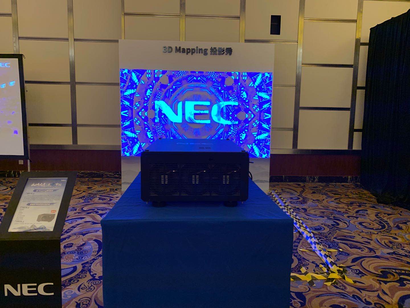 授牌儀式過后,NEC投影機(jī)產(chǎn)品經(jīng)理張凱向大家翔實(shí)地介紹了移動(dòng)式全景投影、全息紗幕投影、立體模型投影等新品解決方案,F(xiàn)場,醒目又炫酷的“NEC”LOGO格外吸睛,運(yùn)用2萬流明英雄系列PX2000UL+ 雙色激光工程投影機(jī),將品牌標(biāo)志做出繽紛絢麗的動(dòng)態(tài)效果。