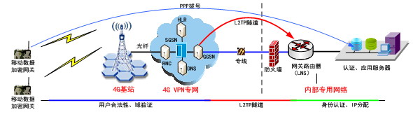 專用無線信道可采用4G VPN、軍用寬帶電臺(tái)、wifi自組網(wǎng)等方式。在非軍事行動(dòng)中,一般采用信號穩(wěn)定、覆蓋范圍更廣的4G VPN系統(tǒng)。該系統(tǒng)具備一定的安全措施,如身份驗(yàn)證、空中加密傳輸、專線連接等。4G VPN專網(wǎng)業(yè)務(wù)流程圖如下所示: