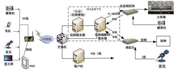 視音頻應(yīng)用系統(tǒng)主要包括視頻服務(wù)器、視音頻編解碼服務(wù)器、視音頻矩陣、調(diào)音臺(tái)、音箱、話筒、大屏幕顯示系統(tǒng)以及視頻會(huì)議系統(tǒng)軟件等。視音頻應(yīng)用系統(tǒng)工作流程如下圖所示: