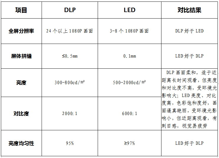 項目 DLP LED 對比結(jié)果 全屏分辨率 24個以上1080P畫面 3-8個1080P畫面 DLP好于LED 屏體拼縫 ≤0.5mm 0.1mm LED好于DLP 亮度 300-800cd/㎡ 500-2000cd/㎡ DLP畫面柔和,適于近距離長時間觀看,但亮度和對比度不高,受環(huán)境光影響大;LED亮度、對比度高,色彩飽和度好,畫面逼真艷麗,受環(huán)境光影響小,但近距離觀看,有刺目感,視覺易疲勞 對比度 2000:1 6000:1 亮度均勻性 95% ≥97% LED好于DLP 顏色一致性 按照單元校正,單元之間存在較小色差 單點校正,顏色一致性高 LED好于DLP 灰度等級 1024 1024 相同 觀看視角 水平及垂直120-160° 水平及垂直大于160° LED好于DLP 光源壽命 60000小時 100000小時 LED好于DLP 環(huán)境要求 溫度0-35℃;濕度20%-80%無結(jié)露;定期清理機箱灰塵 溫度-10℃-40℃;濕度10%-80%無結(jié)露;密閉機箱,灰塵無法進入 LED好于DLP 維護空間 1.2m-1.5m 前維護 LED好于DLP 系統(tǒng)安全 光源雙備份,信號環(huán)路備份 單元板前維護,10秒可更換;電源、控制卡、線路均可雙備份 LED好于DLP