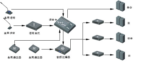 該會議廳一般用于召開會議、演訓導演、觀看錄像、演講授課等活動,采用2.1聲道系統(tǒng)即可滿足需求,同時為確保重大演訓活動時的會議保障安全,需采用主備在線設(shè)計。