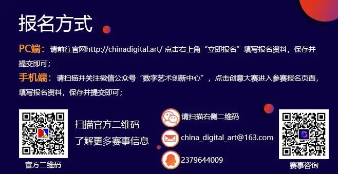 三、參賽對象:本次大賽面向與數(shù)字藝術(shù)相關(guān)行業(yè)的個人或團(tuán)隊,包括高校、企業(yè)、工作室、創(chuàng)意設(shè)計機(jī)構(gòu)等都可參加;