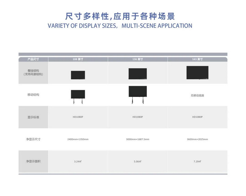 108“、136”、169“大尺寸,給你帶來沉浸式的視覺體驗,另外搭配堅固的腳架方便移動,多種數(shù)據(jù)輸入輸出接口更加方便辦公。