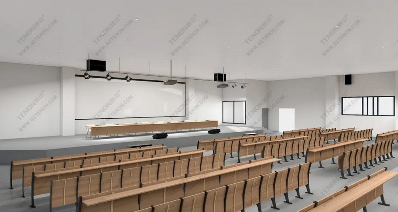 本次騰中為云南某學(xué)校多功能會議廳設(shè)計(jì)方案時(shí),由于具備舞臺功能的多功能會議場所牽涉的關(guān)聯(lián)子系統(tǒng)眾多,各個(gè)子系統(tǒng)既要能獨(dú)立工作,也要與其它子系統(tǒng)聯(lián)動(dòng),而且還要做到集中控制管理。因此要求各個(gè)子系統(tǒng)之間的通信協(xié)議必需非常匹配,設(shè)計(jì)要求難度非常的大。從整個(gè)會場考慮,除涉及到傳統(tǒng)多功能會議室所必備的大屏幕顯示系統(tǒng)、投影系統(tǒng)、手拉手會議系統(tǒng)、無線會議系統(tǒng)、高清信號切換系統(tǒng)、擴(kuò)聲系統(tǒng)、中央控制系統(tǒng)外,為了舞臺特效而加入舞臺燈光系統(tǒng)。