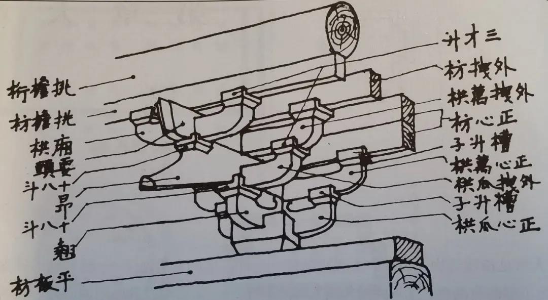 其中,屋頂?shù)奶厥廨喞侵袊?guó)建筑外形上最顯著的特征,屋檐支出深遠(yuǎn)則又為其特點(diǎn)之一,為求這檐部的支出,用多層曲木承托,便在構(gòu)架中產(chǎn)生了一個(gè)重要的斗拱部分。
