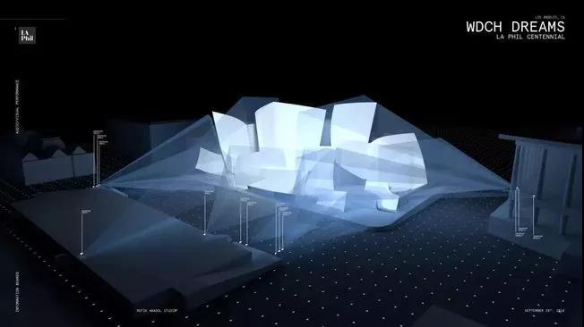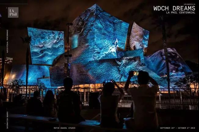 沃爾特·迪斯尼音樂廳,坐落洛杉磯,擁有起伏的不銹鋼外觀。這一年Refik Anadol和他的團隊接到一項任務(wù)將這座音樂廳打造為“夢想”主題的大型藝術(shù)裝置。Anadol擅長數(shù)據(jù)整合創(chuàng)作,于是他提出:“用一種創(chuàng)造性的、計算機化的“大腦” 來模仿人類如何做夢,通過處理記憶來形成圖像和想法的新組合。”