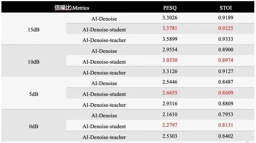 測(cè)試結(jié)果顯示,短時(shí)目標(biāo)清晰度(STOI)與語音質(zhì)量的感知評(píng)估(PESQ)均有所提升,并且隨著降噪量的提升,AI降噪效果的優(yōu)勢(shì)還能進(jìn)一步凸顯。