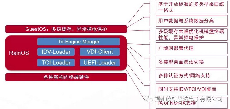 TCI與IDV同樣應(yīng)用于邊緣計算場景,即行業(yè)俗稱的云桌面“胖終端”場景,但不同的是,TCI技術(shù)采用的不是虛擬化架構(gòu),而是通過引導(dǎo)技術(shù)即TCI-Loader來實(shí)現(xiàn)桌面鏡像的加載,鏡像加載后,直接在硬件上運(yùn)行,可以看出,相比IDV技術(shù),TCI沒有虛擬化層即Hypervisor,所以可以實(shí)現(xiàn)“終端硬件資源更全獲得、外設(shè)兼容性進(jìn)一步提升、終端硬件兼容性更好”的效果。