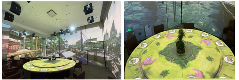 Inspire 系列投影機(jī)安裝在貴賓包間的天花板上(左);顯示在桌面上的栩栩如生的動(dòng)畫(huà)視覺(jué)效果(右)