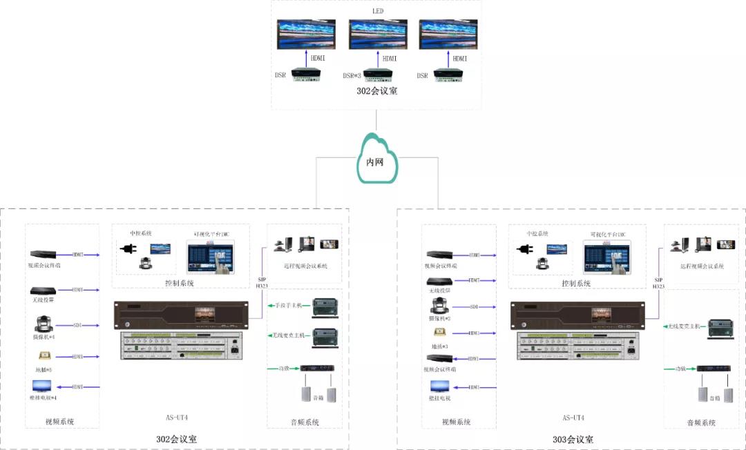 為了滿足以上需求,視通科技使用2臺(tái)UT4錄播主機(jī)、5臺(tái)DSR分布式設(shè)備。集視頻處理、音頻處理、環(huán)境中控、錄播、視頻會(huì)議交互功能于一體,通過(guò)可視化管理平臺(tái)實(shí)現(xiàn)會(huì)議管理、圖像調(diào)度、過(guò)程錄制等多媒體會(huì)議應(yīng)用。