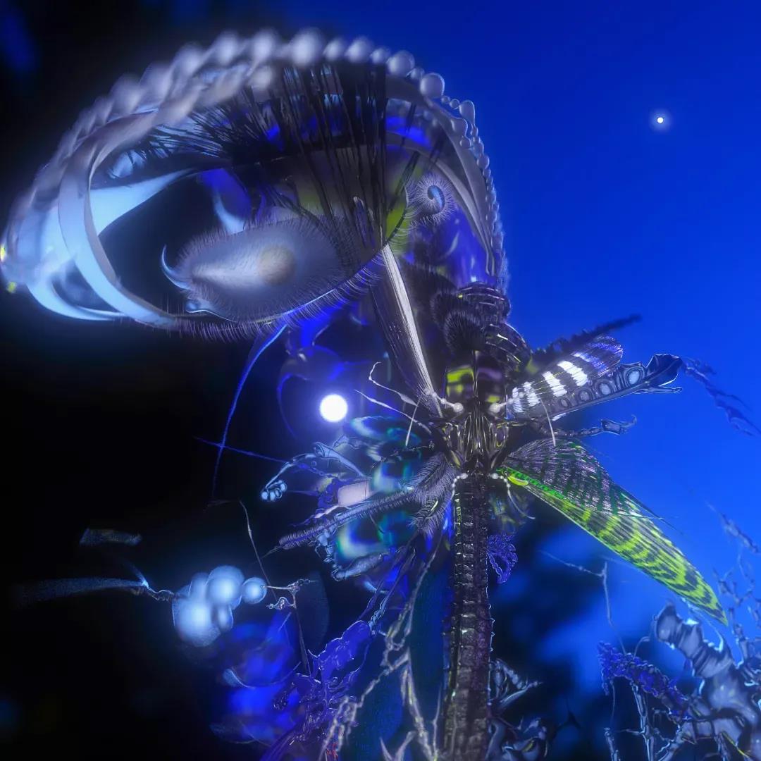 由于昆蟲是一種節(jié)肢動(dòng)物,在身體結(jié)構(gòu)上也是一種模塊化的結(jié)合方式,這個(gè)特點(diǎn)和機(jī)器很像。大悲宇宙覺得這可以很好的銜接機(jī)械設(shè)計(jì)的美學(xué)邏輯,在那個(gè)階段他嘗試了甲蟲、螳螂各種各樣的小昆蟲,最終發(fā)現(xiàn)蝴蝶具有非常好的承載能力,因?yàn)楹m然是一個(gè)三維生物但是是二維的呈現(xiàn),算法在蝴蝶上的呈現(xiàn)只需要將蝴蝶平鋪開來就可以顯示所有的信息,并且在一張圖片中就可以完成,而其他生物則需要三視圖來將所有信息鋪展出來,并且最重要的一點(diǎn),蝴蝶上所承載的紋理和造型不管是哪種形狀給人的感覺都不會(huì)有非常大的抵觸感,在表現(xiàn)力和算法的有效性上蝴蝶都存在極大的優(yōu)勢(shì),最后大悲宇宙從最開始的奇奇怪怪的昆蟲落地到了蝴蝶上面。