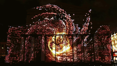 遇上3D投影,建筑就像有了生命,還能以不同的模樣展現(xiàn)在我們面前。比如飛流瀑布、繽紛花朵、太空漫游、山崩地裂、冰封雪裹、火光沖天、海底世界等,這些視覺效果既有磚飛瓦走的氣勢磅礴,靜謐絕美的撩人,又有飛沙走石的驚心動魄。一幀幀掠過,一片片渲染,給我們神奇的視覺、聽覺、感覺體驗,真是美不勝收!
